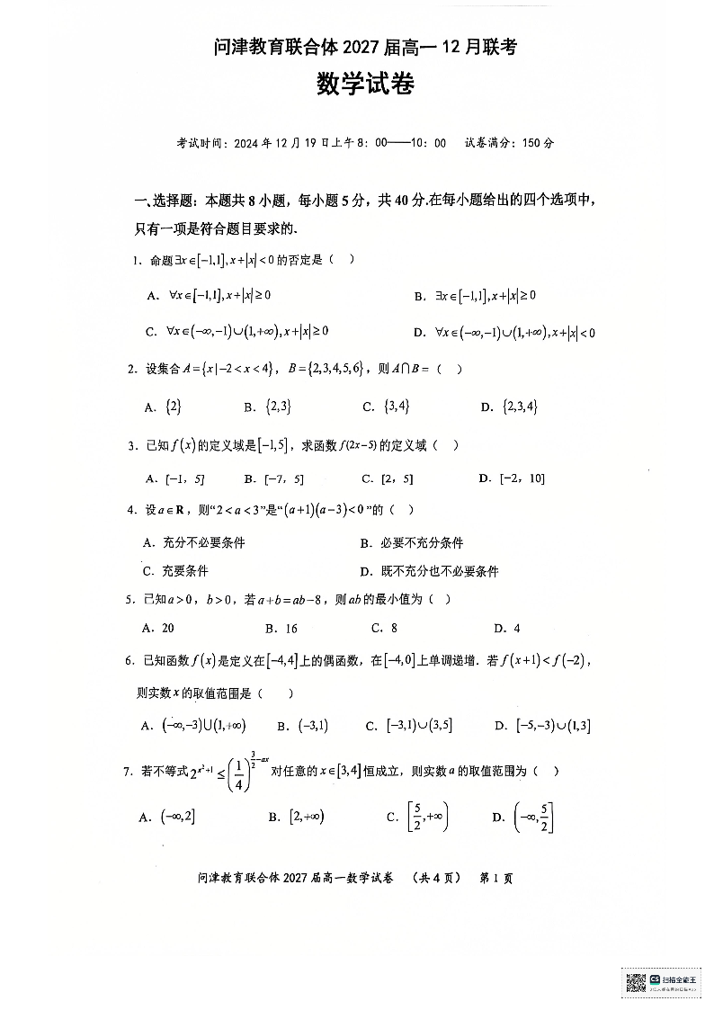 湖北省武汉市问津教育联合体2024-2025学年高一上学期12月联考数学