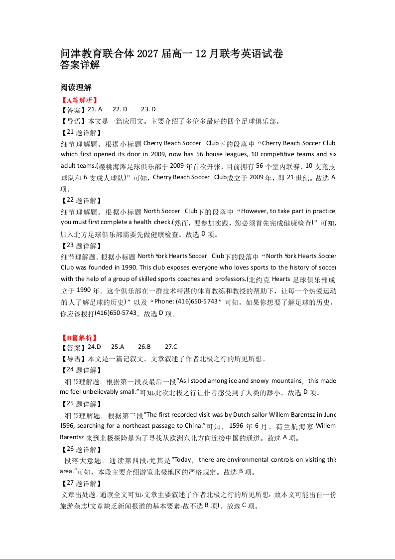 湖北省武汉市问津教育联合体2024-2025学年高一上学期12月联考英语答案
