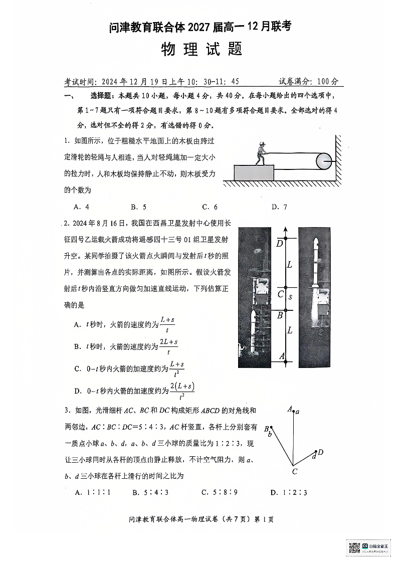 湖北省武汉市问津教育联合体2024-2025学年高一上学期12月联考物理