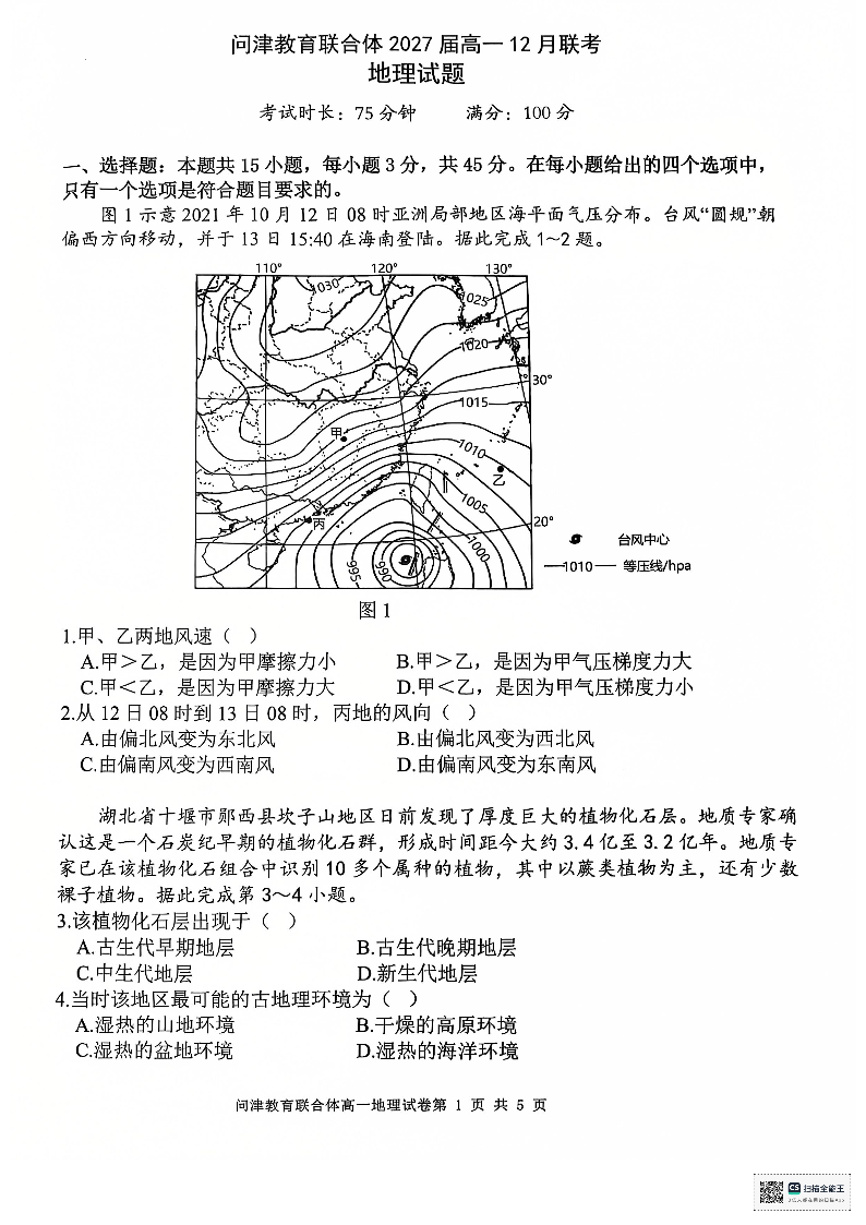 湖北省武汉市问津教育联合体2024-2025学年高一上学期12月联考地理