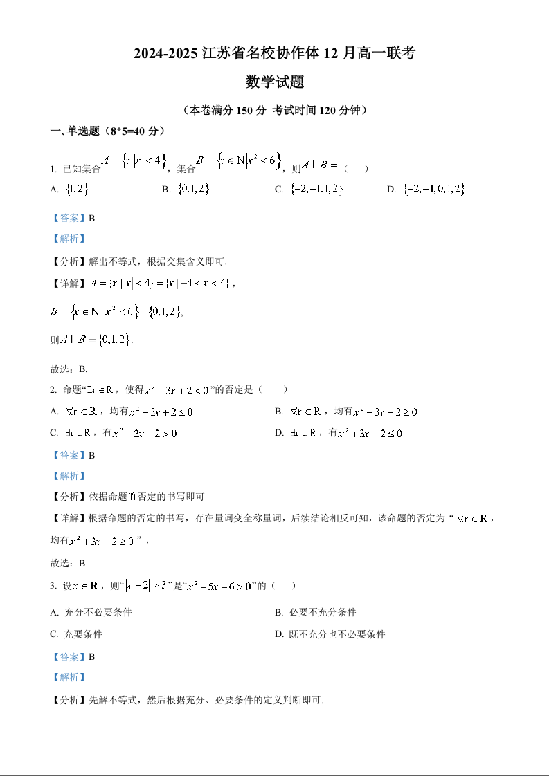江苏省名校协作体2024-2025学年高一上学期12月联考数学(解析版)