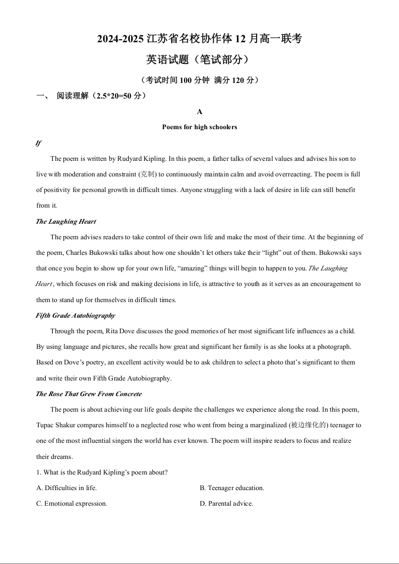 江苏省名校协作体2024-2025学年高一上学期12月联考英语(解析版)