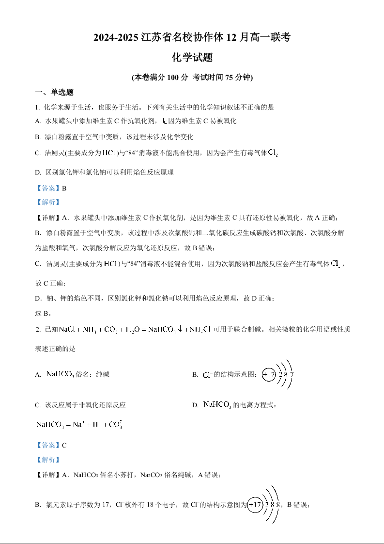 江苏省名校协作体2024-2025学年高一上学期12月联考化学(解析版)