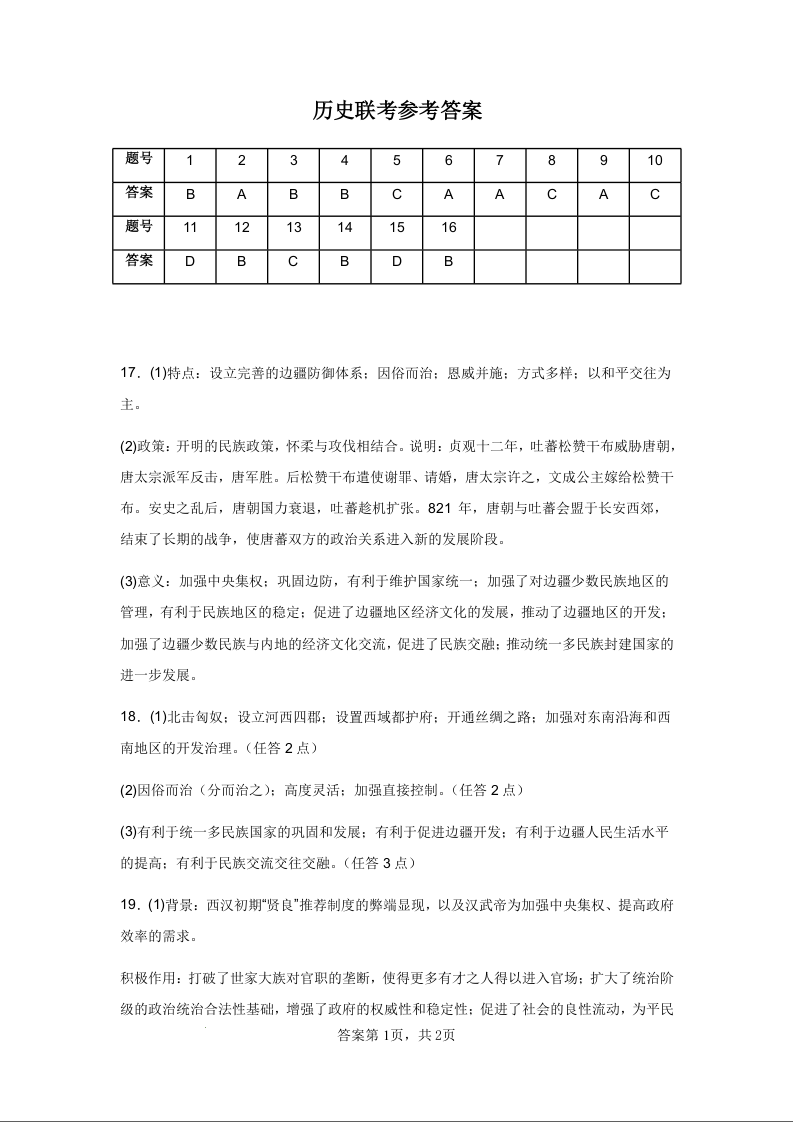 江苏省名校协作体2024-2025学年高一上学期12月联考历史答案