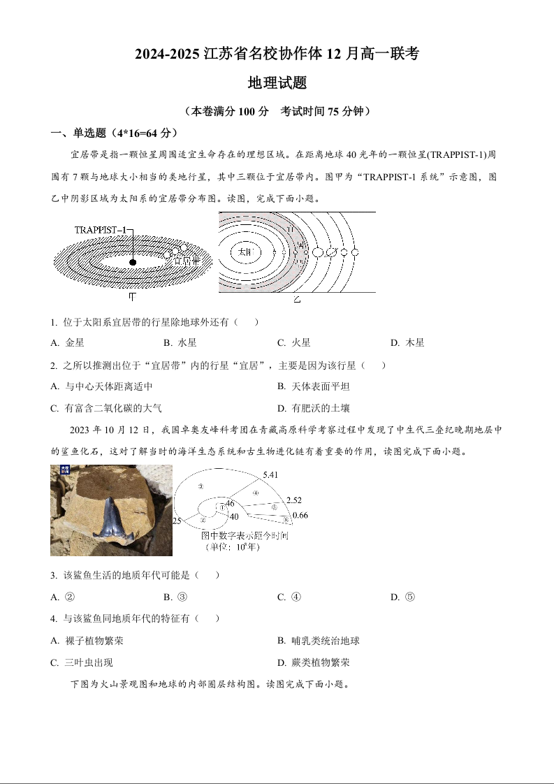 江苏省名校协作体2024-2025学年高一上学期12月联考地理(原卷版)