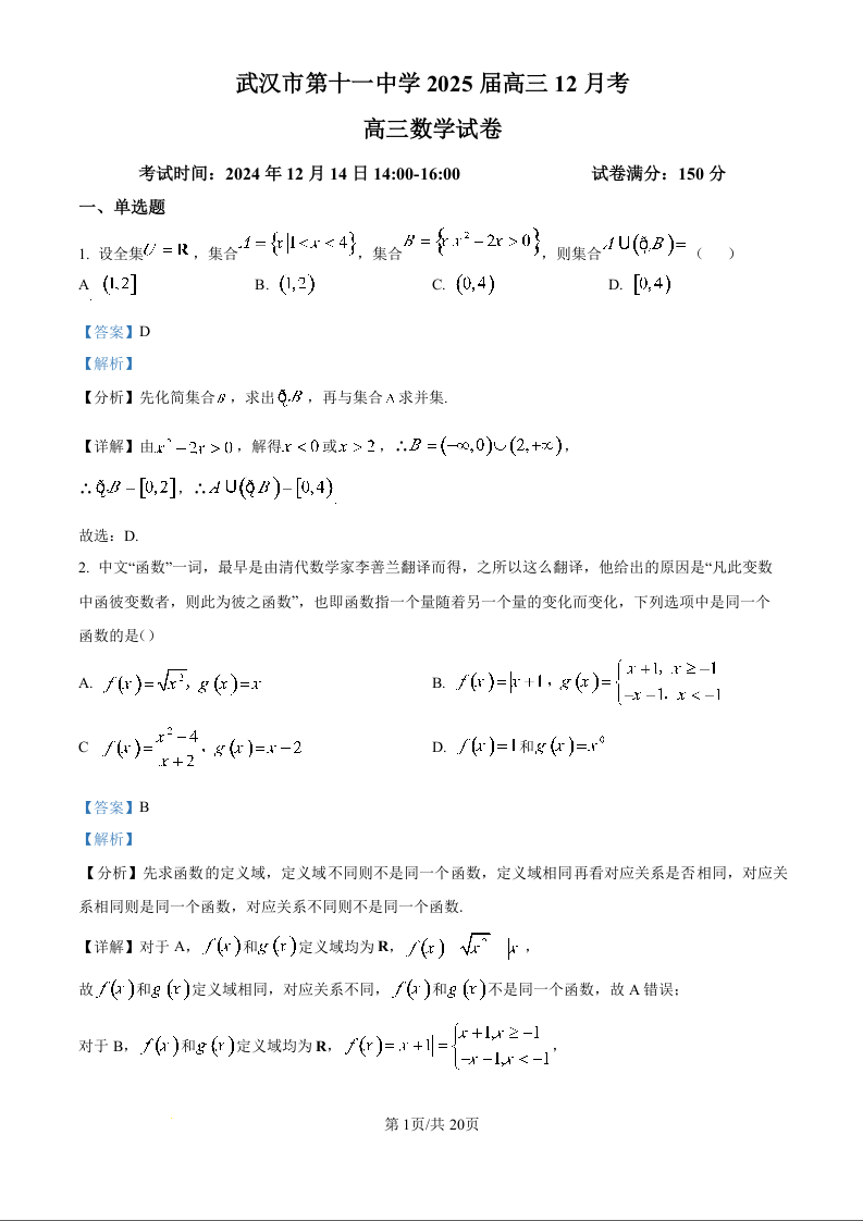 湖北省武汉市第十一中学2025届高三上学期12月月考数学(精品解析版)