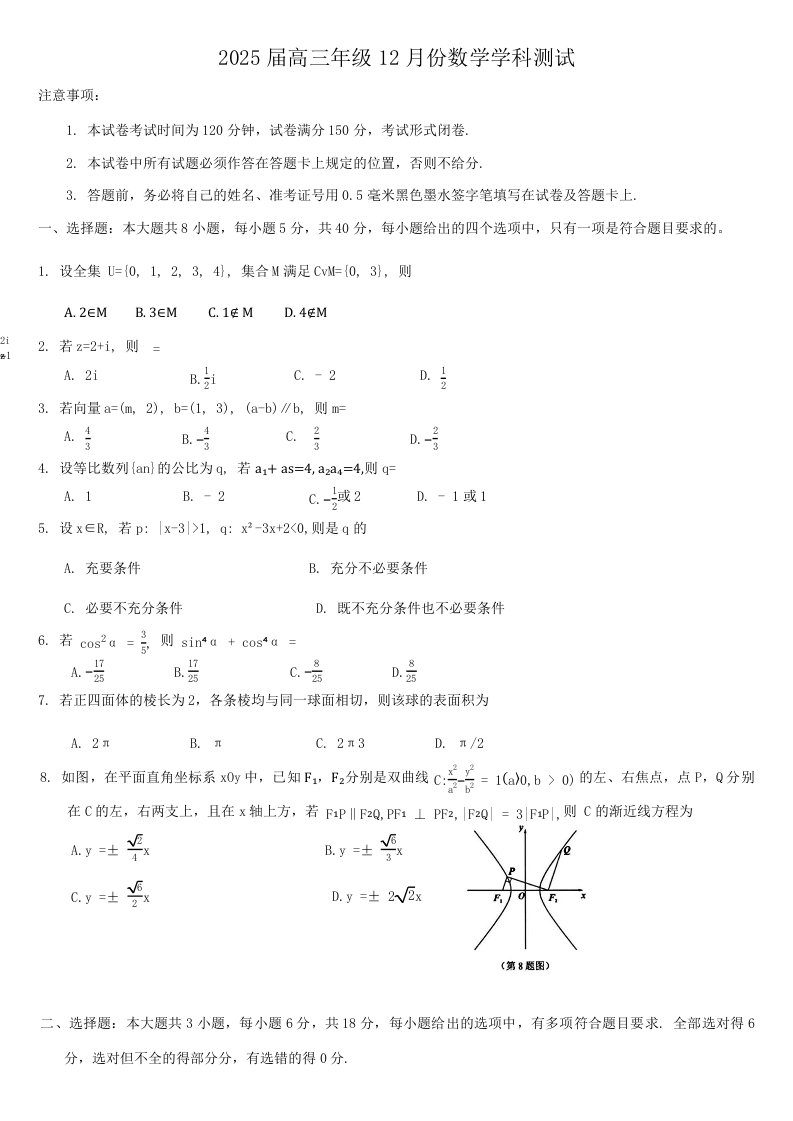 江苏省南师附中、天一中学、海安中学、海门中学四校2025届高三上学期12月联考数学+答案