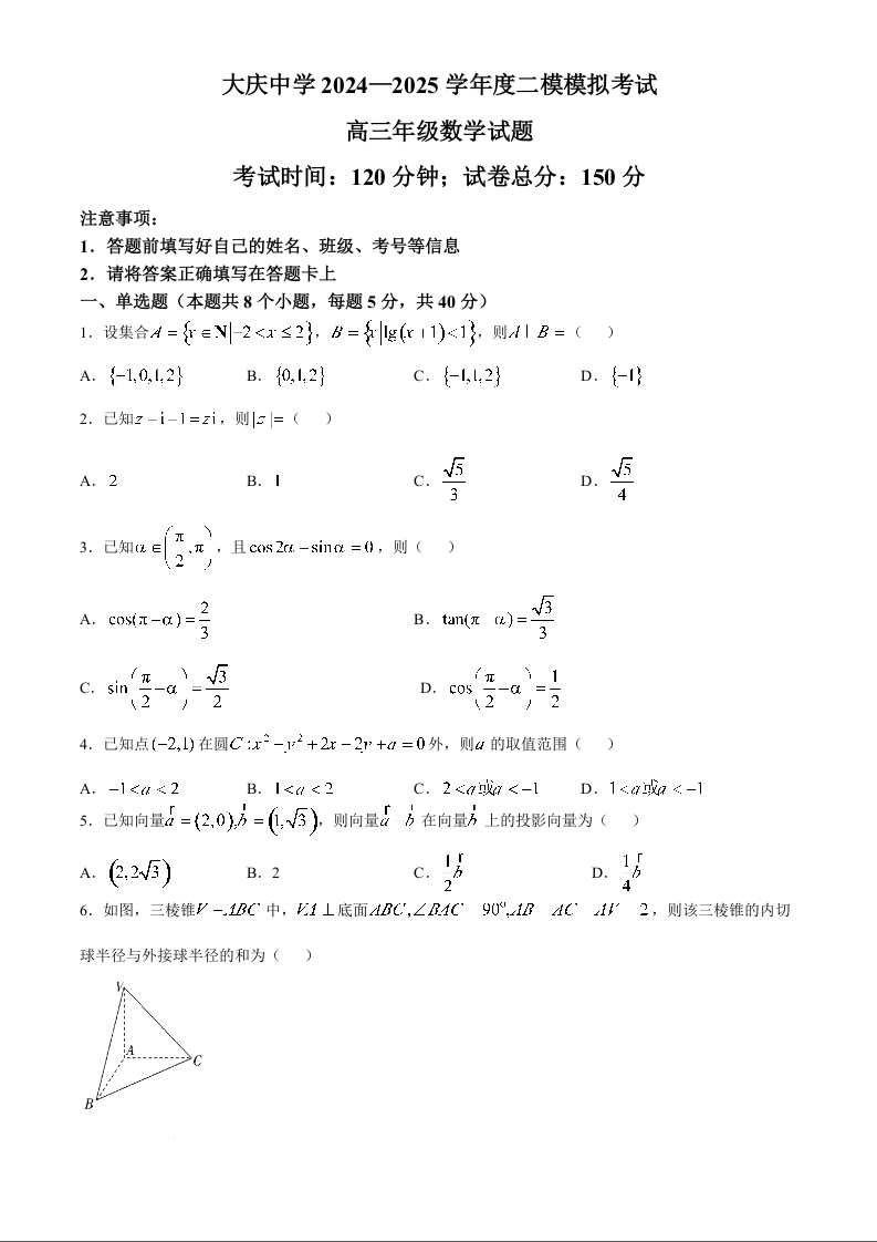 黑龙江省大庆中学2025届高三上学期第二次模拟考试数学+答案