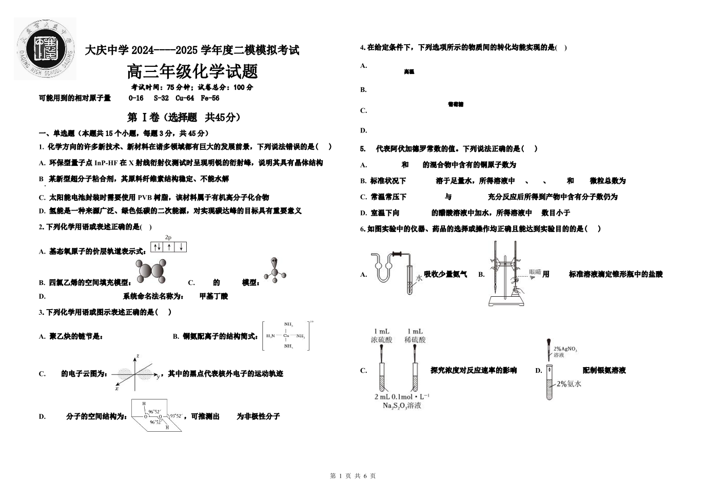 黑龙江省大庆中学2025届高三上学期第二次模拟考试化学