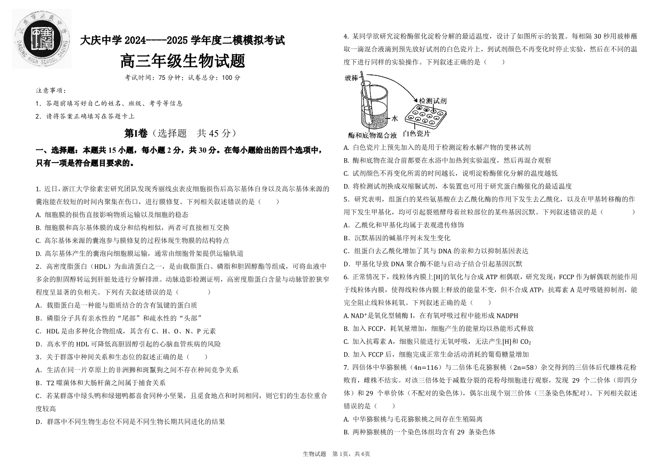 黑龙江省大庆中学2025届高三上学期第二次模拟考试生物