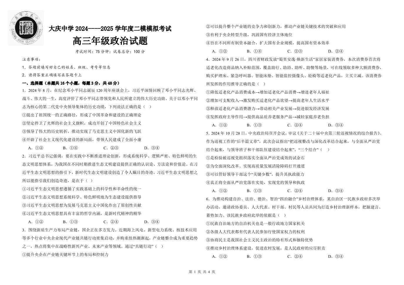 黑龙江省大庆中学2025届高三上学期第二次模拟考试政治