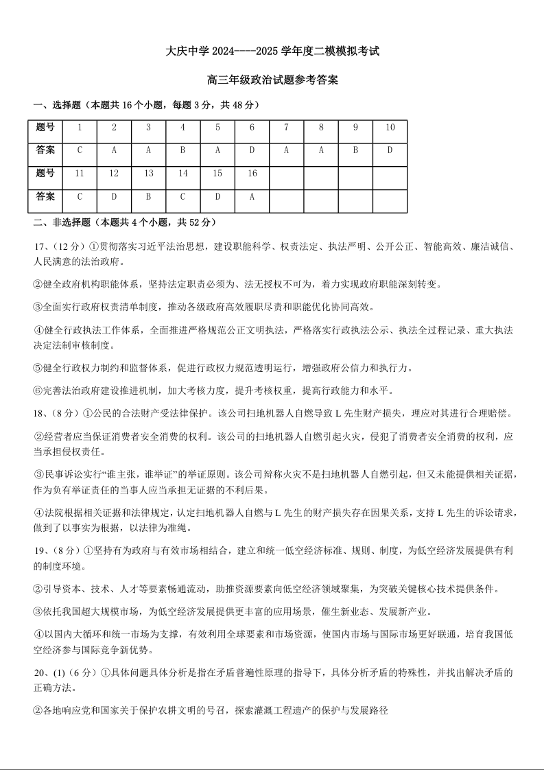 黑龙江省大庆中学2025届高三上学期第二次模拟考试政治答案
