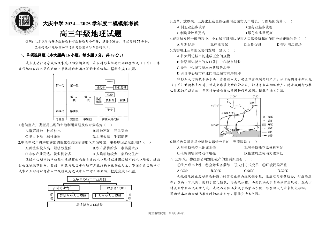 黑龙江省大庆中学2025届高三上学期第二次模拟考试地理
