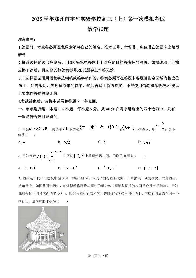 河南省郑州市宇华实验学校2025届高三上学期第一次模拟考试数学(原卷版)
