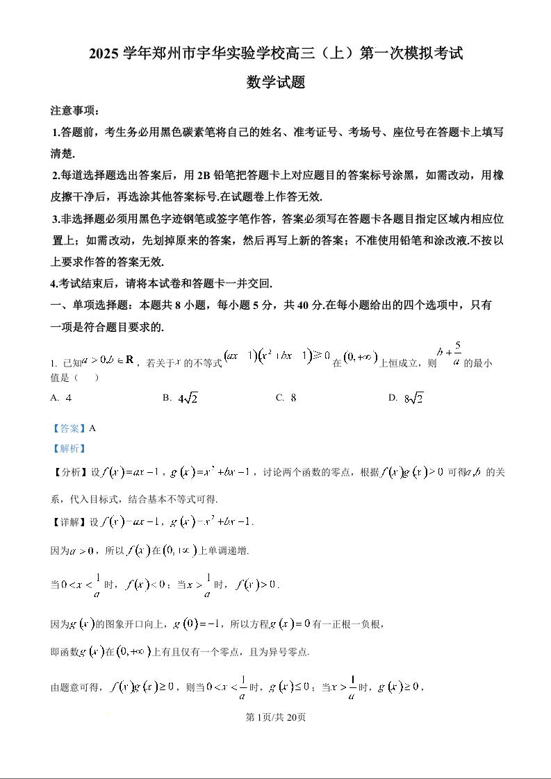河南省郑州市宇华实验学校2025届高三上学期第一次模拟考试数学(精品解析版)