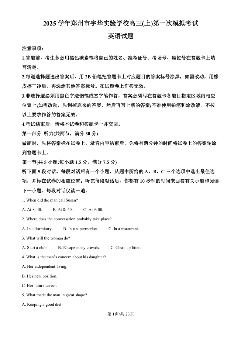河南省郑州市宇华实验学校2025届高三上学期第一次模拟考试英语(精品解析版)