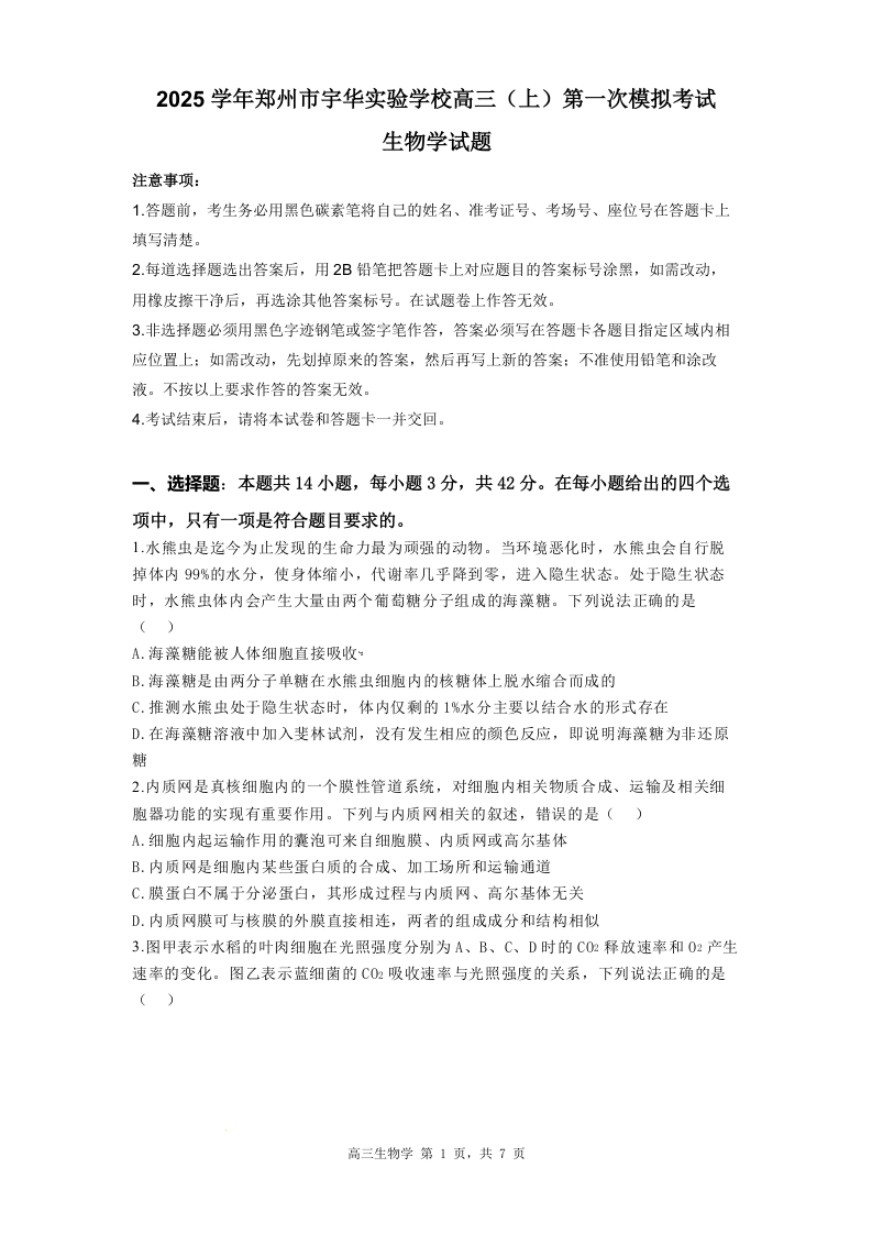 河南省郑州市宇华实验学校2025届高三上学期第一次模拟考试生物