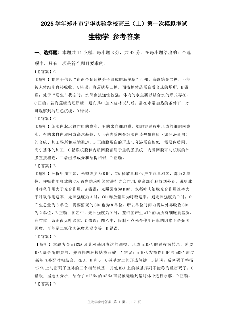 河南省郑州市宇华实验学校2025届高三上学期第一次模拟考试生物答案