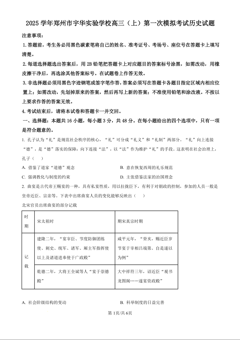河南省郑州市宇华实验学校2025届高三上学期第一次模拟考试历史(原卷版)