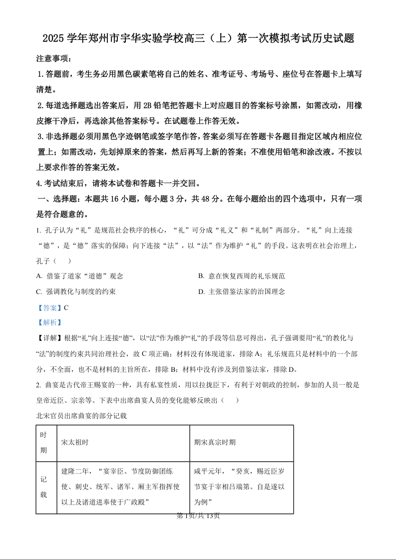 河南省郑州市宇华实验学校2025届高三上学期第一次模拟考试历史(精品解析版)