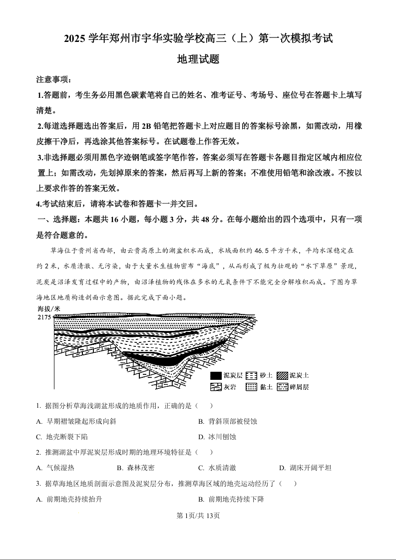河南省郑州市宇华实验学校2025届高三上学期第一次模拟考试地理(精品解析版)