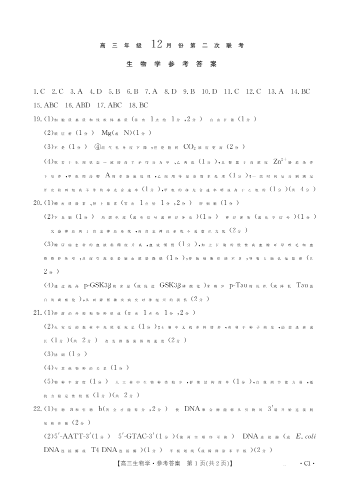 河北省邢台市2025届高三上学期第二次联考生物答案