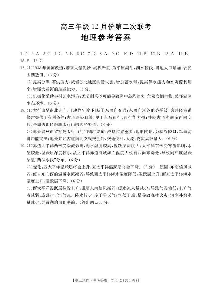 河北省邢台市2025届高三上学期第二次联考地理答案