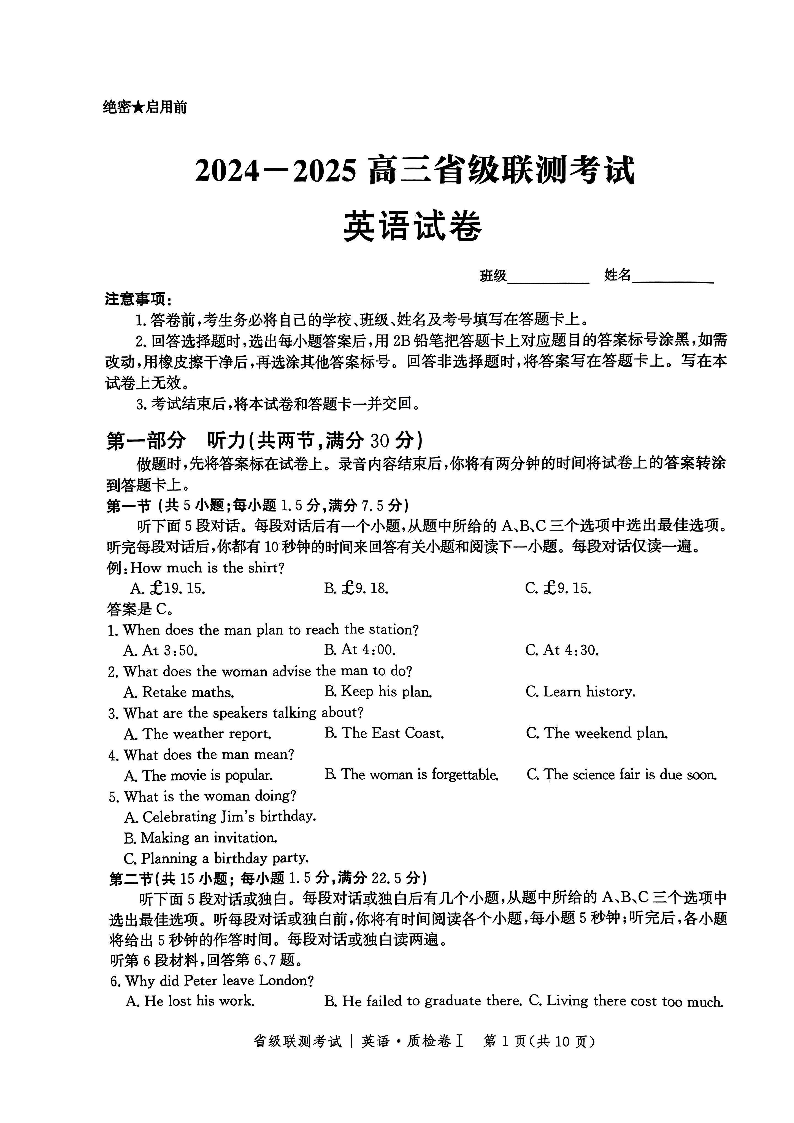 河北省省级联考2025届高三上学期1月期末考试英语