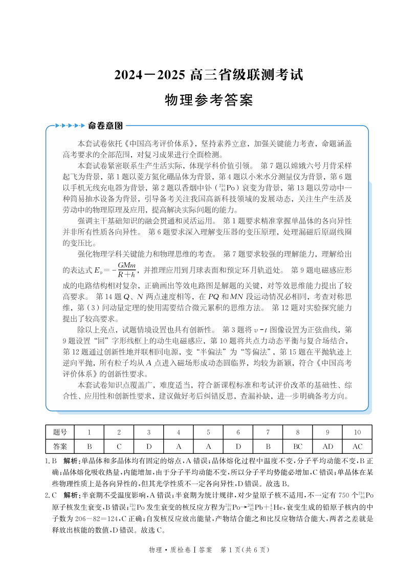 河北省省级联考2025届高三上学期1月期末考试物理答案