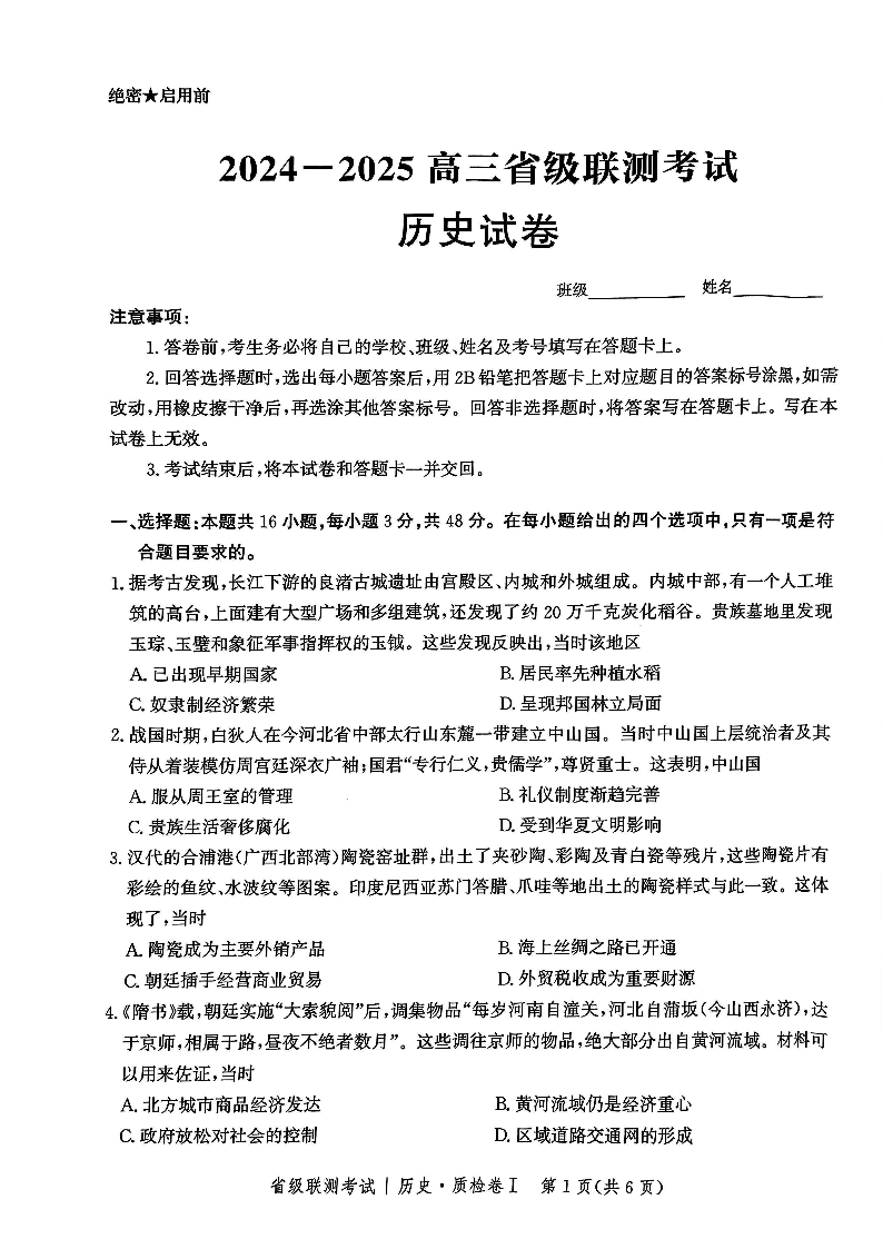 河北省省级联考2025届高三上学期1月期末考试历史