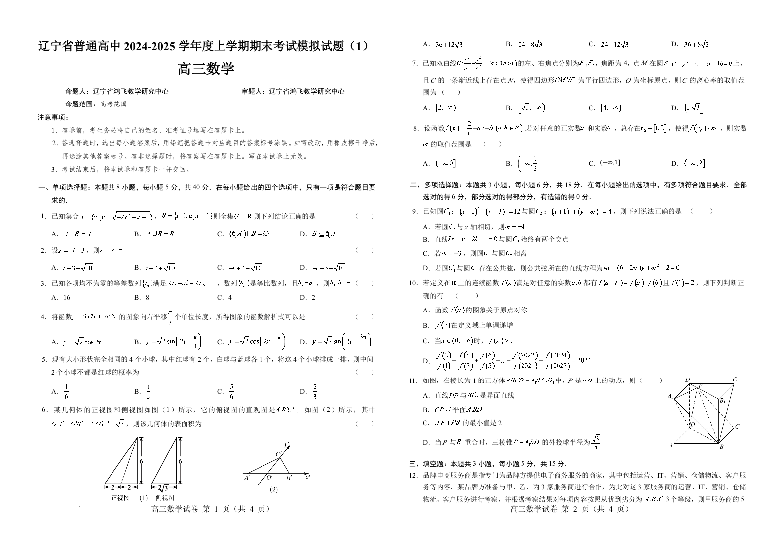 【文字版】辽宁省普通高中2024-2025学年高三上学期1月期末考试模拟数学(1)