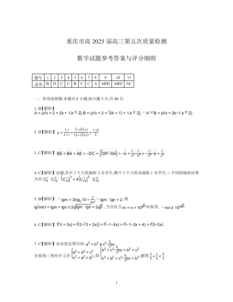 重庆市南开中学2025届高三第五次质量检测数学答案