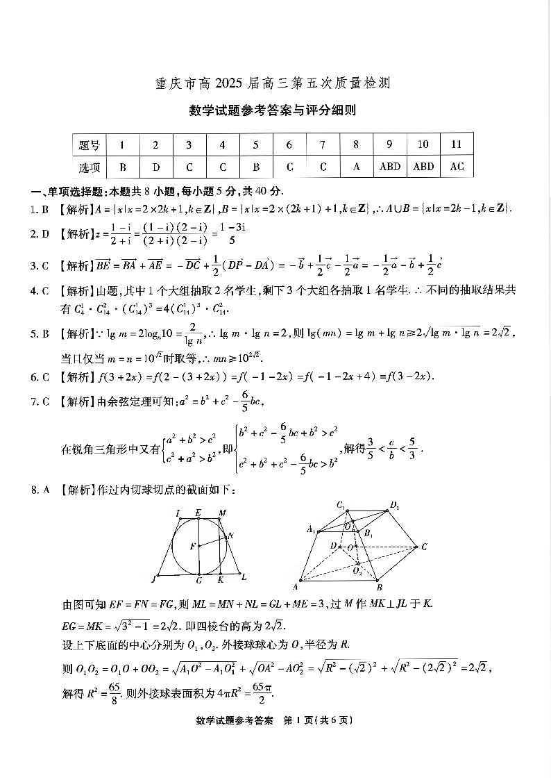 重庆市南开中学2025届高三第五次质量检测数学答案