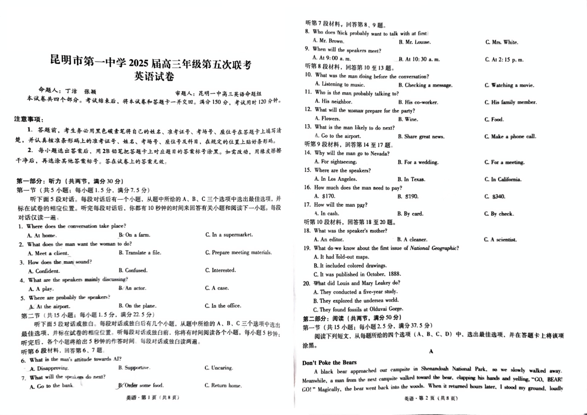 云南省昆明市第一中学2025届高三上学期第五次联考英语