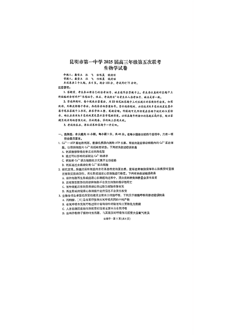 云南省昆明市第一中学2025届高三上学期第五次联考生物