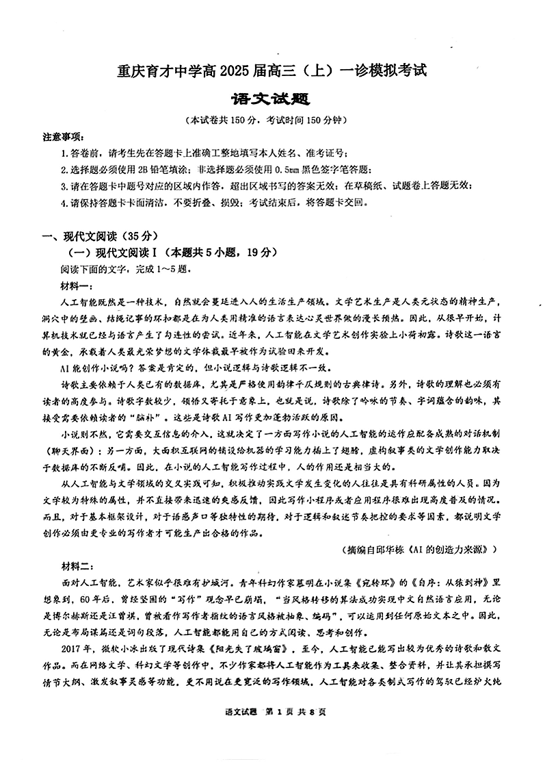 重庆市育才中学校2025届高三一诊模拟考试语文