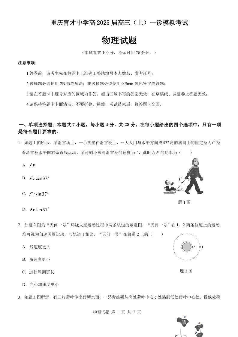 重庆市育才中学校2025届高三一诊模拟考试物理