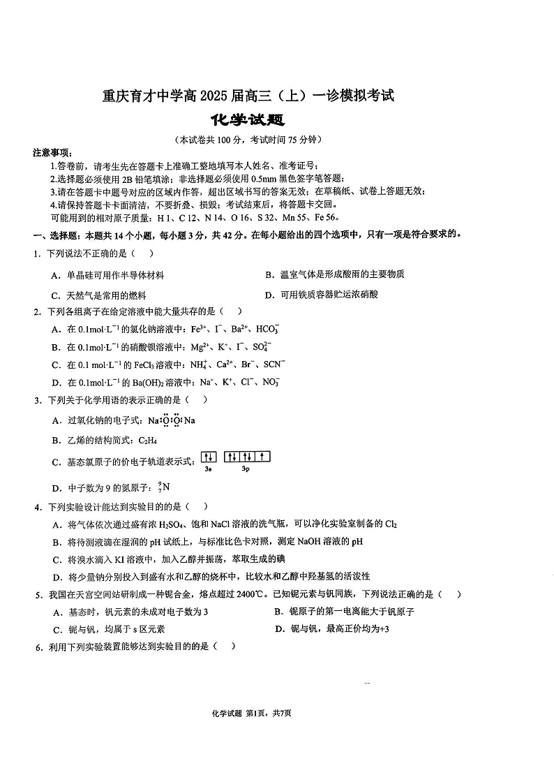 重庆市育才中学校2025届高三一诊模拟考试化学