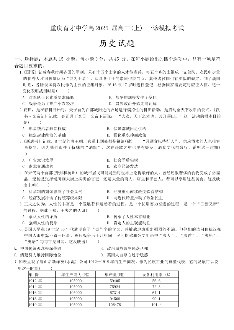 重庆市育才中学校2025届高三一诊模拟考试历史