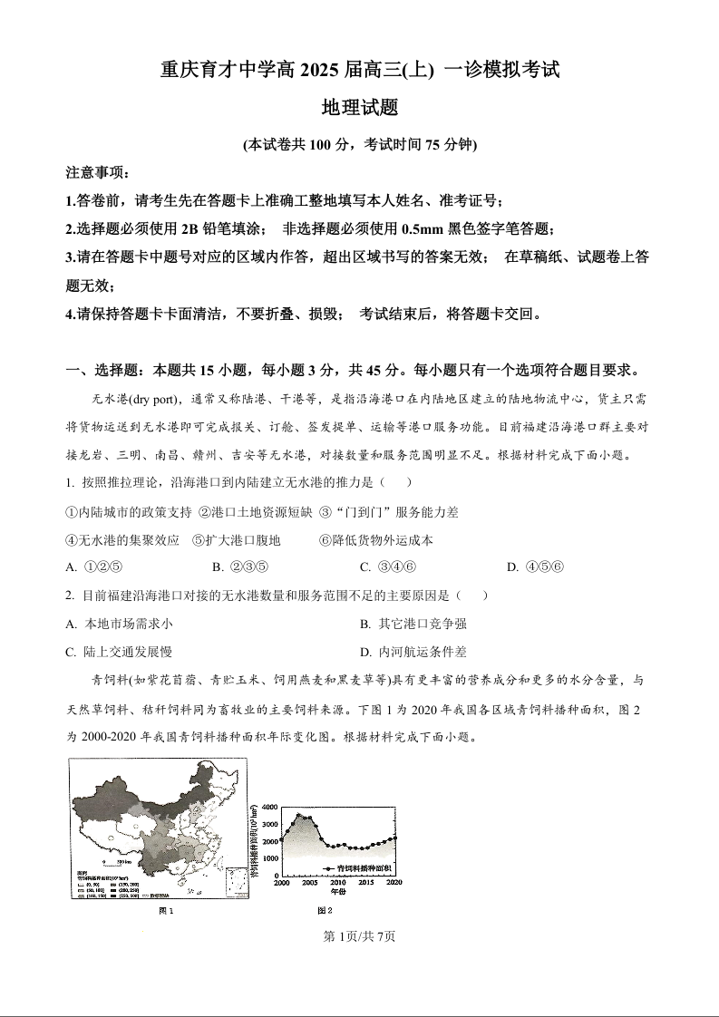 重庆市育才中学校2025届高三一诊模拟考试地理(原卷版)