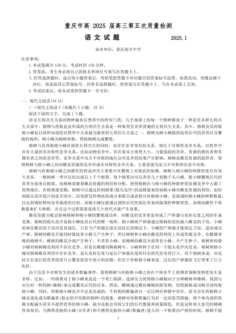 重庆市南开中学2025届高三第五次质量检测语文