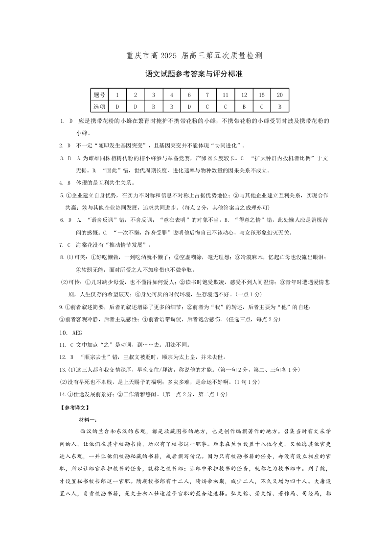重庆市南开中学2025届高三第五次质量检测语文答案