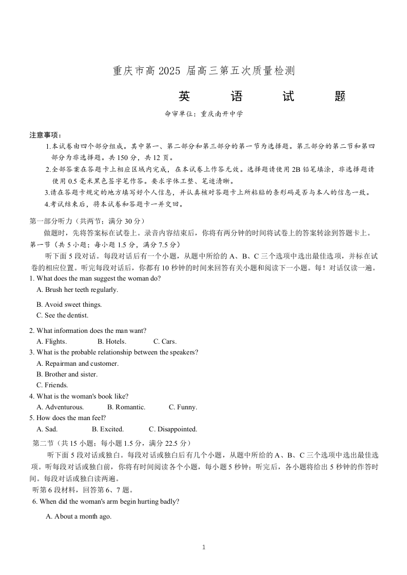 重庆市南开中学2025届高三第五次质量检测英语
