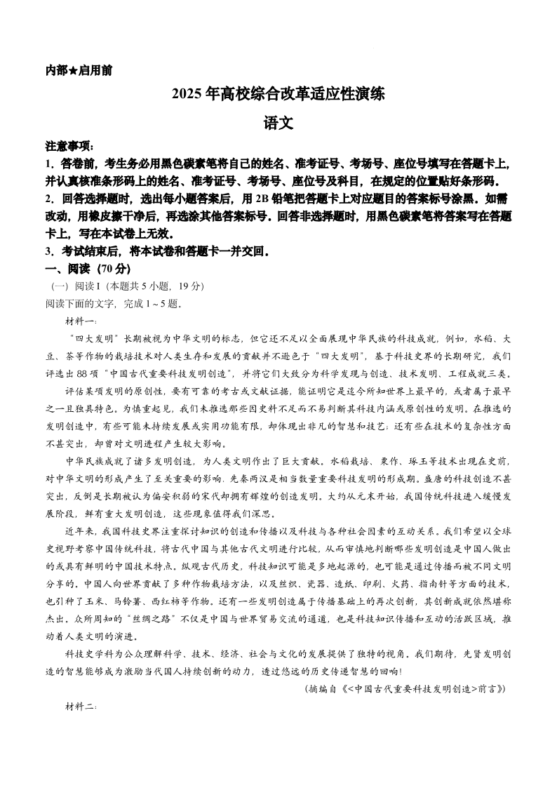 【八省联考】新八省联考2025年高考综合改革适应性演练语文