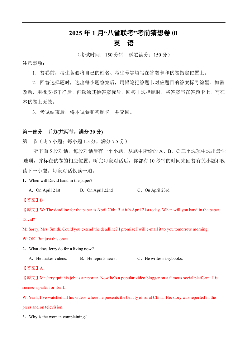 2025年1月“八省联考”考前猜想卷英语01全解全析