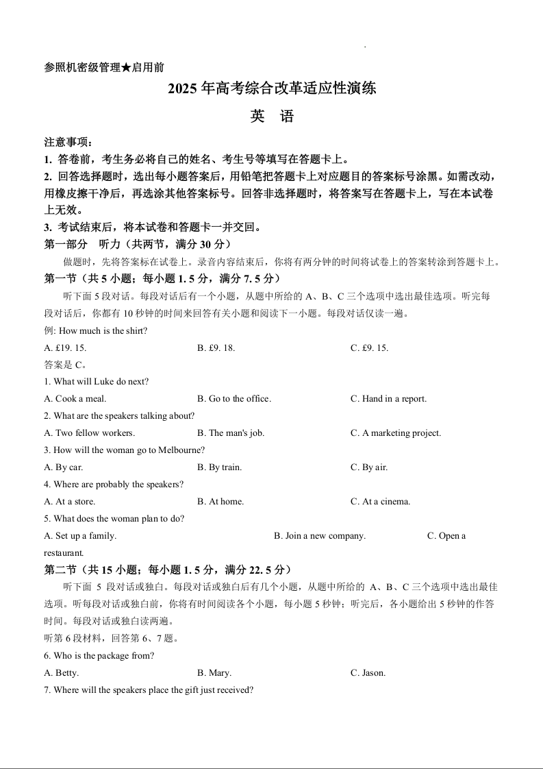 【八省联考】新八省联考2025年1月普通高等学校招生全国统一考试适应性测试英语
