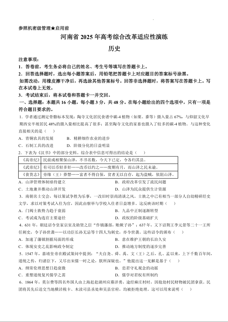 新八省联考2025年河南省高考综合改革适应性演练历史