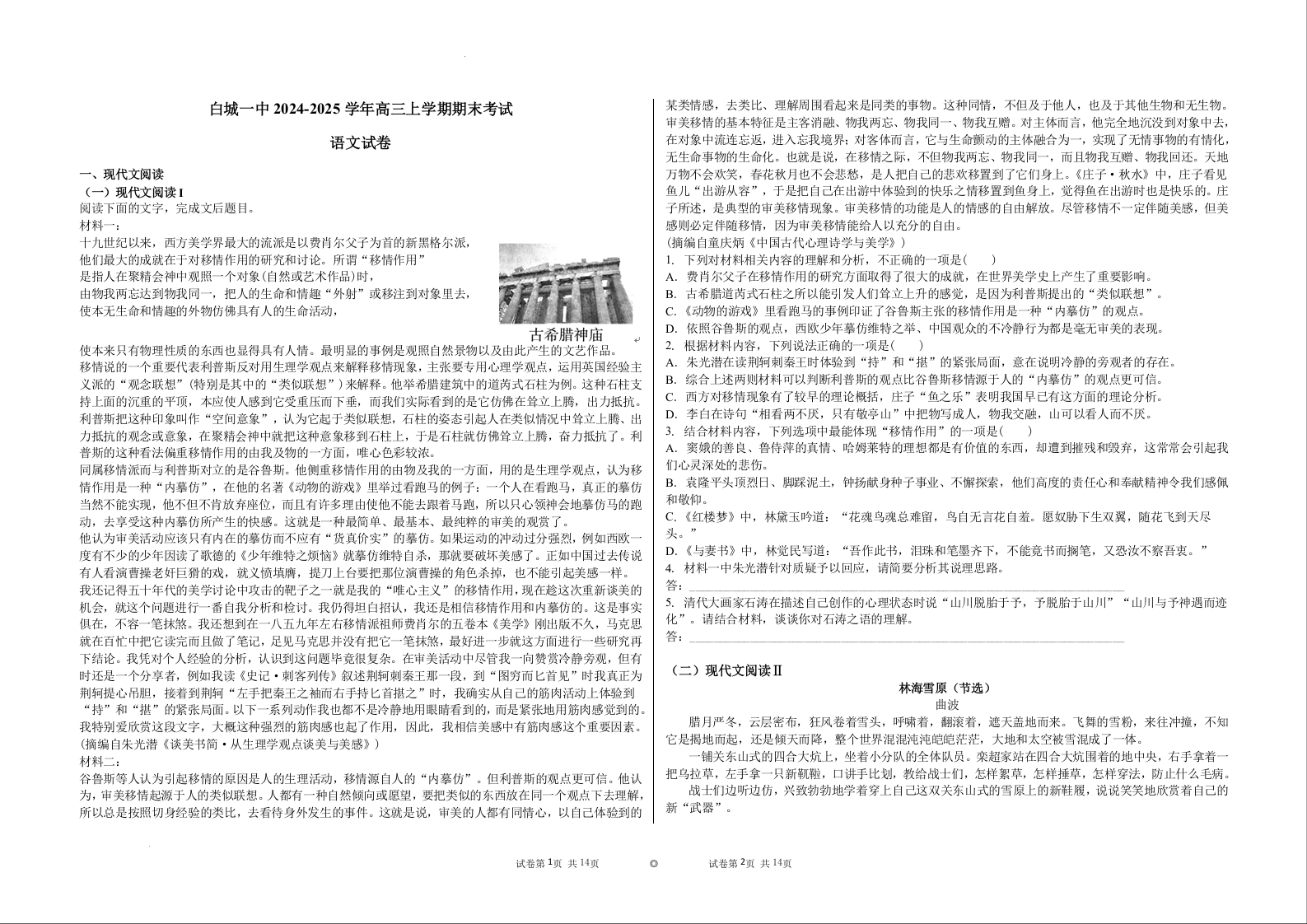 吉林省白城市第一中学2025届高三上学期1月期末考试语文+答案