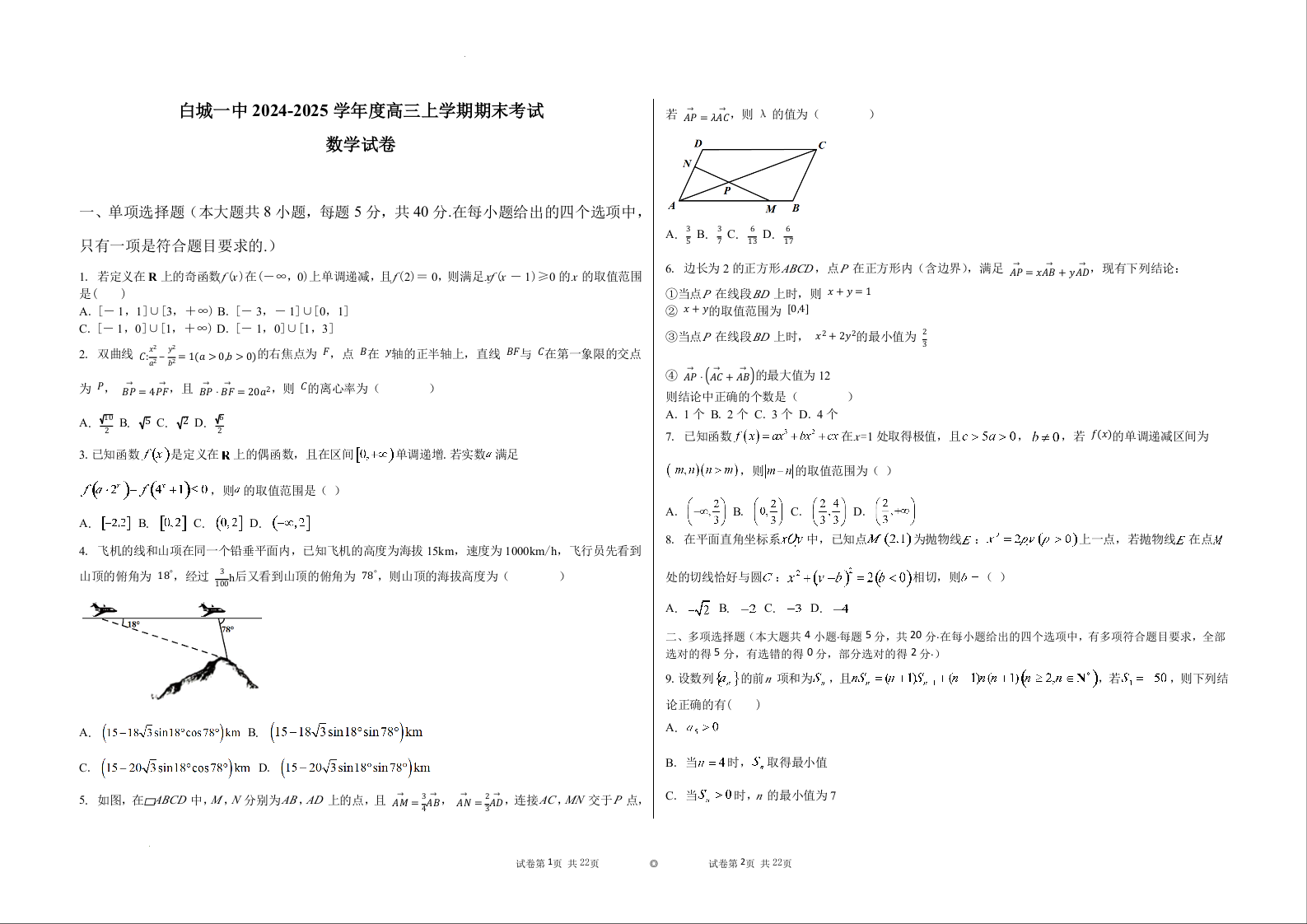 吉林省白城市第一中学2025届高三上学期1月期末考试数学+答案