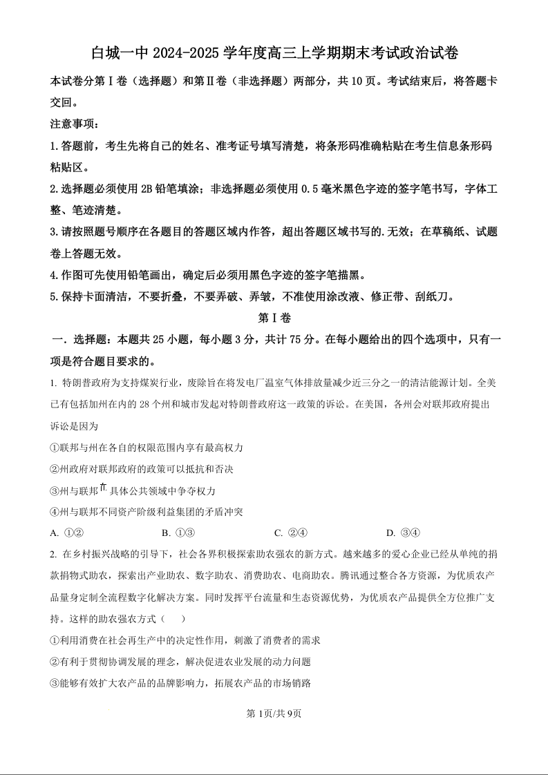 吉林省白城市第一中学2025届高三上学期1月期末考试政治(原卷版)